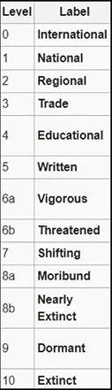 [5] Lewis, M. P., & Simons, G. F. (2010). Description of the Expanded Graded Intergenerational Disruption Scale (EGIDS). Retrieved from https://www.lingv.ro/RRL%202%202010%20art01Lewis.pdf